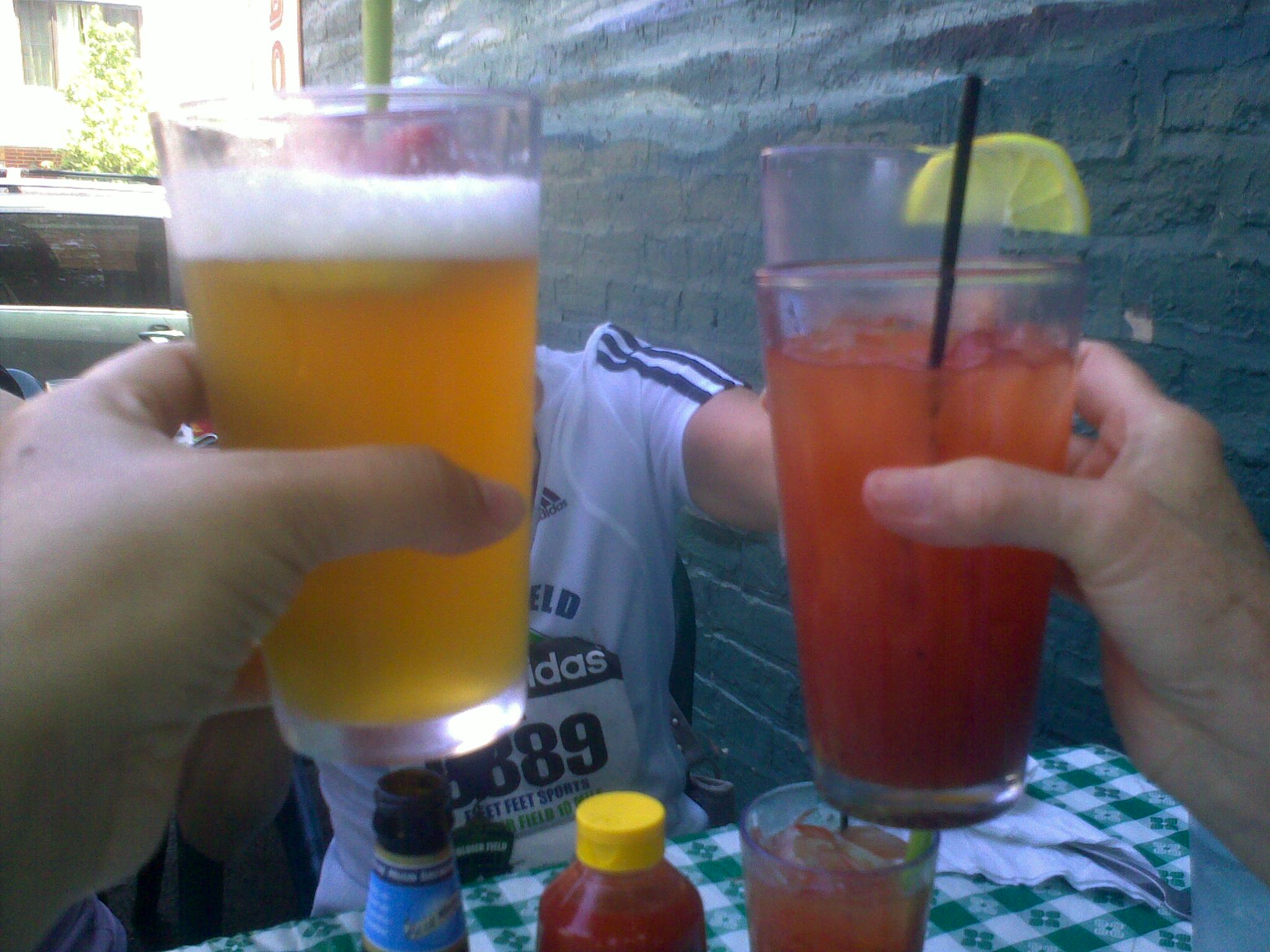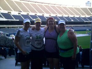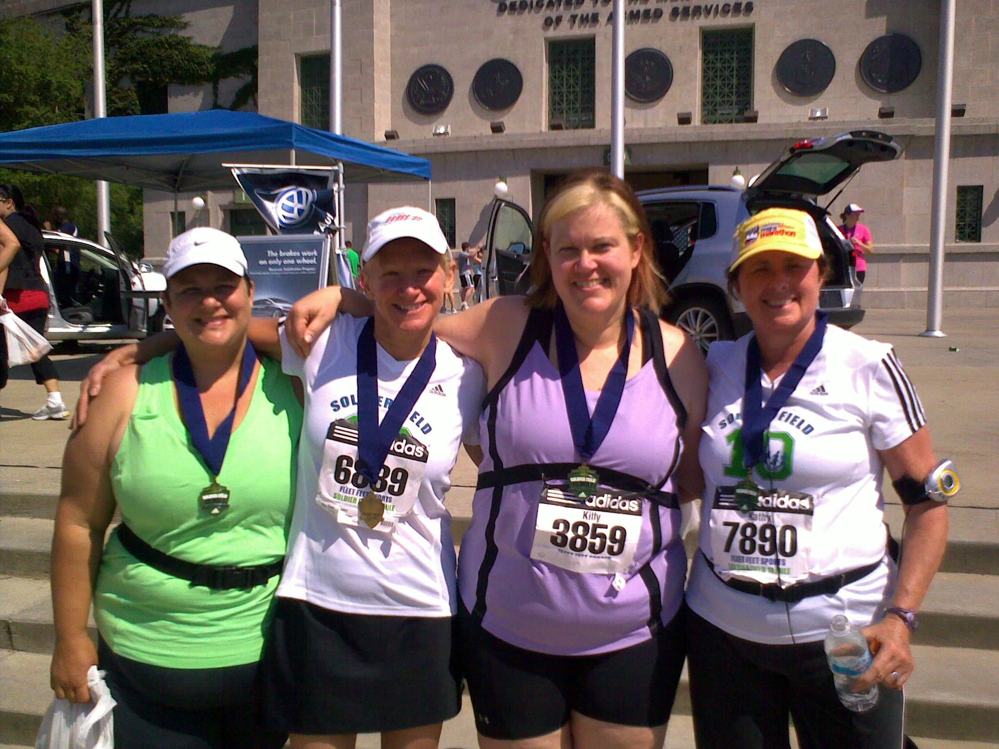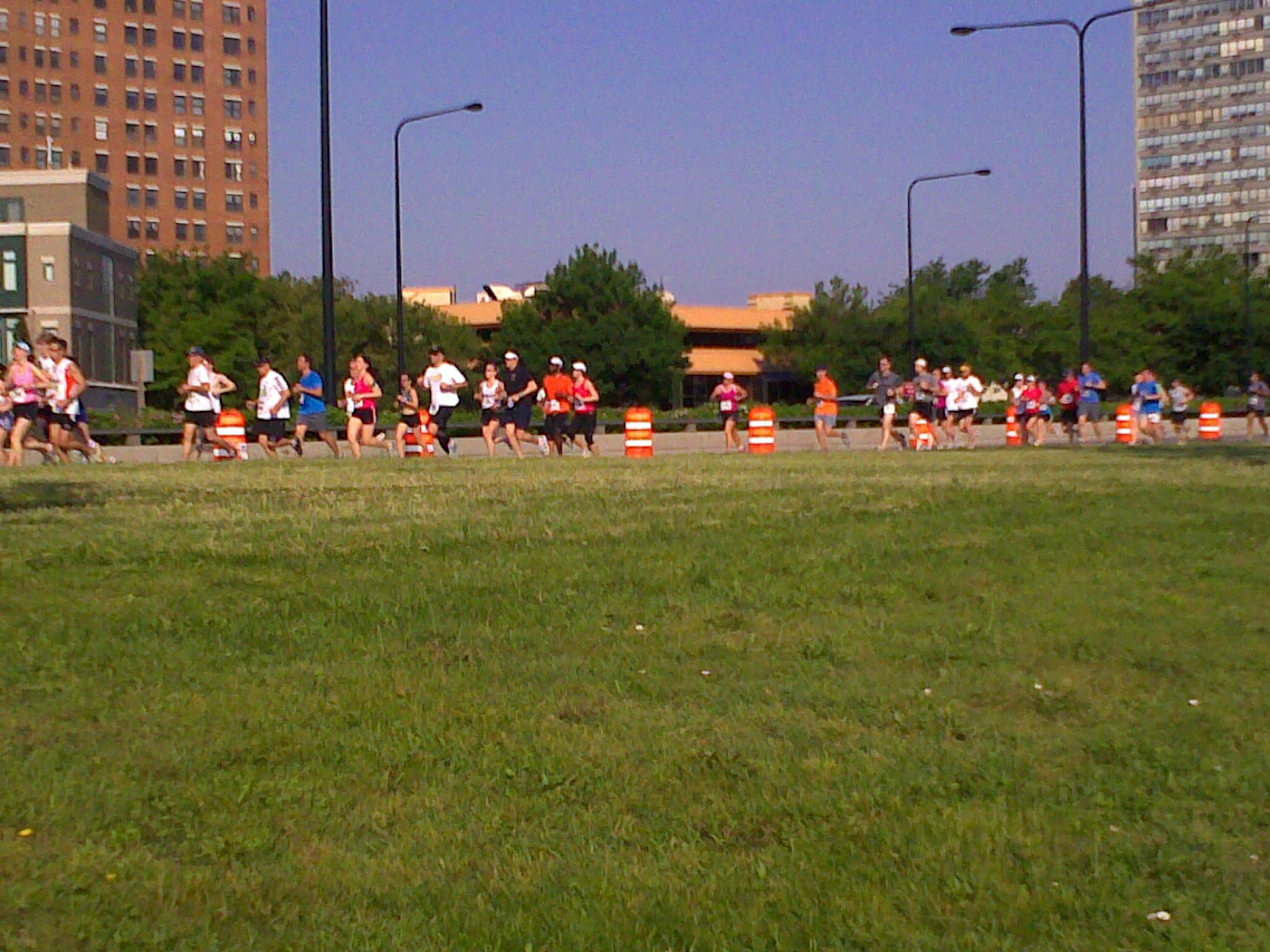 I couldn’t sleep Friday night.  I was tossing and tossing about in the sheets.  When I saw K, K and L the next morning it seemed we were all in the same boat.  The plan of action was this, K and I would start at about 6:30, head south on the path till we got to 51st street, or wherever the Garmin told us we had completed 5 miles.  We said goodbye to K and L and took off at our snails’ pace.  Honestly, the first few miles were so beautiful.  I don’t know what was different about the run, but I had no problems breathing and felt good.  I was very happy for my hat as the sun was baking hot.  We were the first people across the 5 mile timing pad which made me laugh pretty hard.  I was imagining someone at a computer wondering how the heck these two got there so fast, granted we passed it going the wrong way.  At the turn around, we started seeing other runners, we saw the leader and then 8,000 runners started to pass us.  Note to runners, the best way to get encouragement during the race is to be a fattie.  Many people took time out of their run to congratulate us and tell us how good we were doing.  Partially in shock I believe, I am sure there were some questions as to how we got there so fast.  We did finish the race!  It was exciting.  I felt like dying at the end and those last 2 miles sucked.  I was so happy that P our partner and friend who couldn’t do the run cause of an injury cheered us on went the last few miles with us.  Here are some shots of the day.