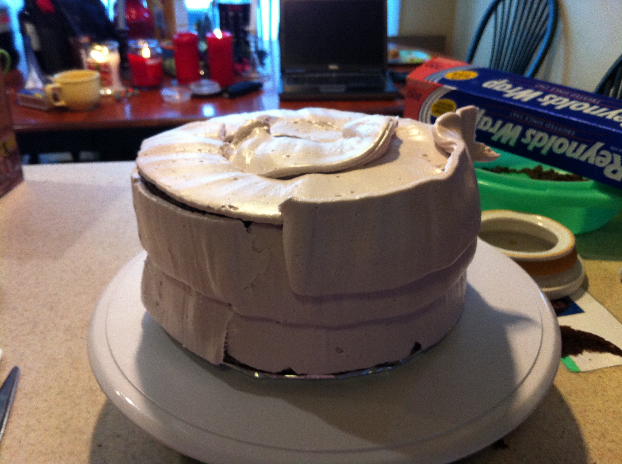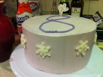 Wedding cake practice #2 happened this weekend. It was a family friend’s birthday. She was having a winter ice skating party. I decided to give the purple hue of the frosting for the wedding cake a try. Chose chocolate cake for the girl and used the Swiss Meringue recipe given by baker friend. The cake itself seemed to bake a little unevenly this time around with more burning on the edges. I saw a remedy for this online and a family member offered to donate some of her baking tools to the cause. Apparently she has something that helps the cake bake evenly. The frosting turned out better than even the first time.