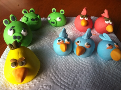 A few weeks ago, my good friend virtual farm girl was beginning to plan her daughter’s birthday party. Being who I am I was very curious to learn about the cake! At that point she didn’t have a plan, bit knew she wanted an angry birds cake. I felt up to the challenge though had no idea what to do, but I volunteered to bake the cake. Tonight was my first experience with gum paste. We’ll see what they look like tomorrow. I think it’s a good start.