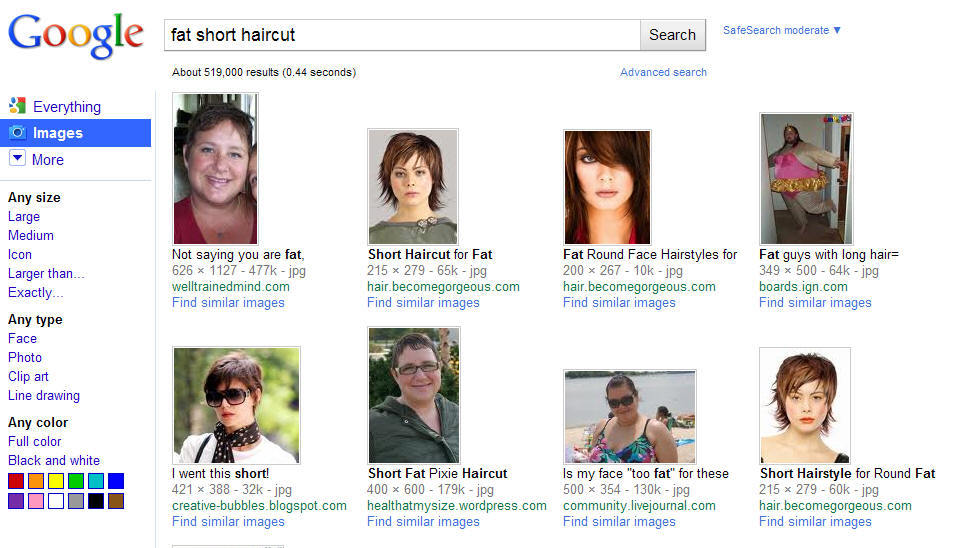 I have mentioned before that the search terms that consistently bring in the highest traffic on the blog have to do with the short fat haircut. I have tinkered with the idea of finding other fatties with short hair to promote. Some people probably wouldn’t appreciate it if I approached them by saying, “hey, I have a blog and like to feature fat women with short hair, can I take your photo??” So I thought I’d whip out the google and give it a test drive. I typed in “fat, short, haircut” in the search bar and clicked on images to get the results. I am BLOWN away with my own fame. All I have to say is, I have the fattest ass and shortest hair around!!!!